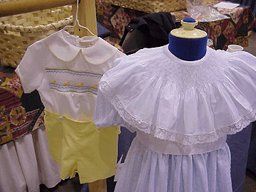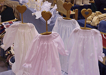 | Smocking is a century old tradition originally designed to decorate gentlemen's clothes in England. This ornate art form is now mostly reserved for application to children's clothing and newborn attire. We take great pride in our hand smocked garments and have won numerous awards for our skill in this unique art form. We offer classes in smocking for those who want t create their own special heirlooms to pass down through the generations. Some typical examples of our work can be seen in the photos below, including Bonnets, Bibs and Booties as well as girls dresses and boys suits. |